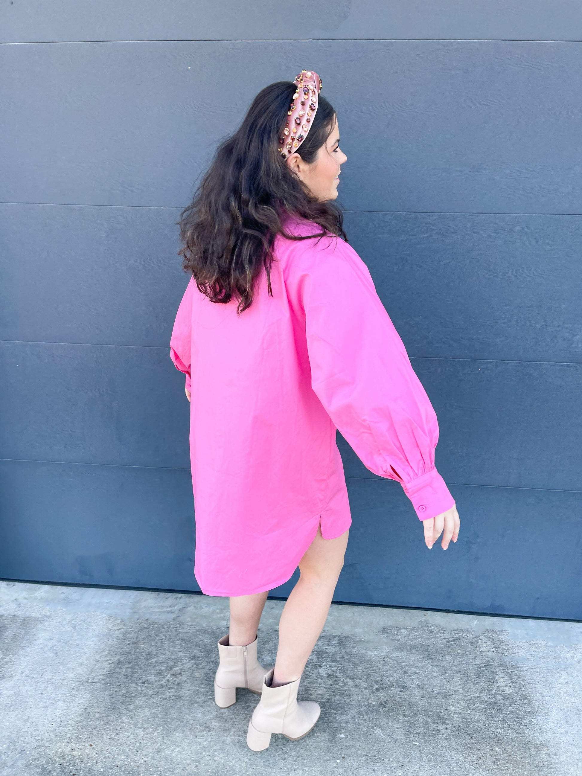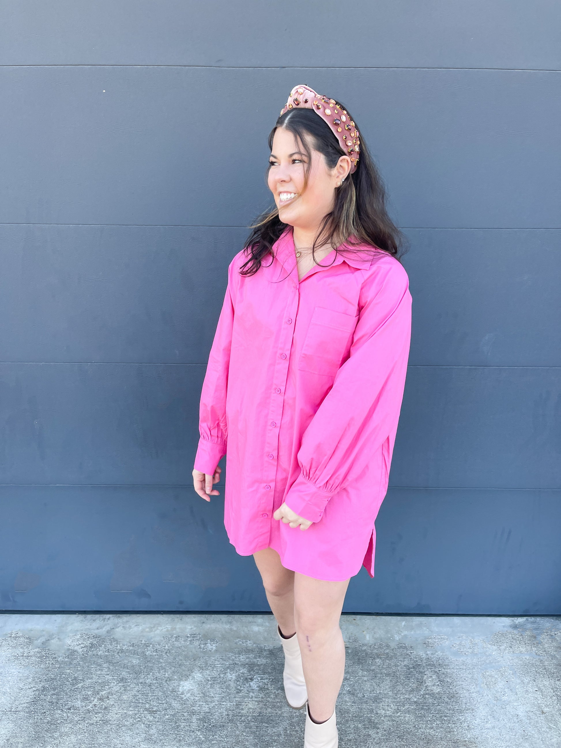 Candy pink button down shirt dress. Model is 5’6 wearing a S/M.