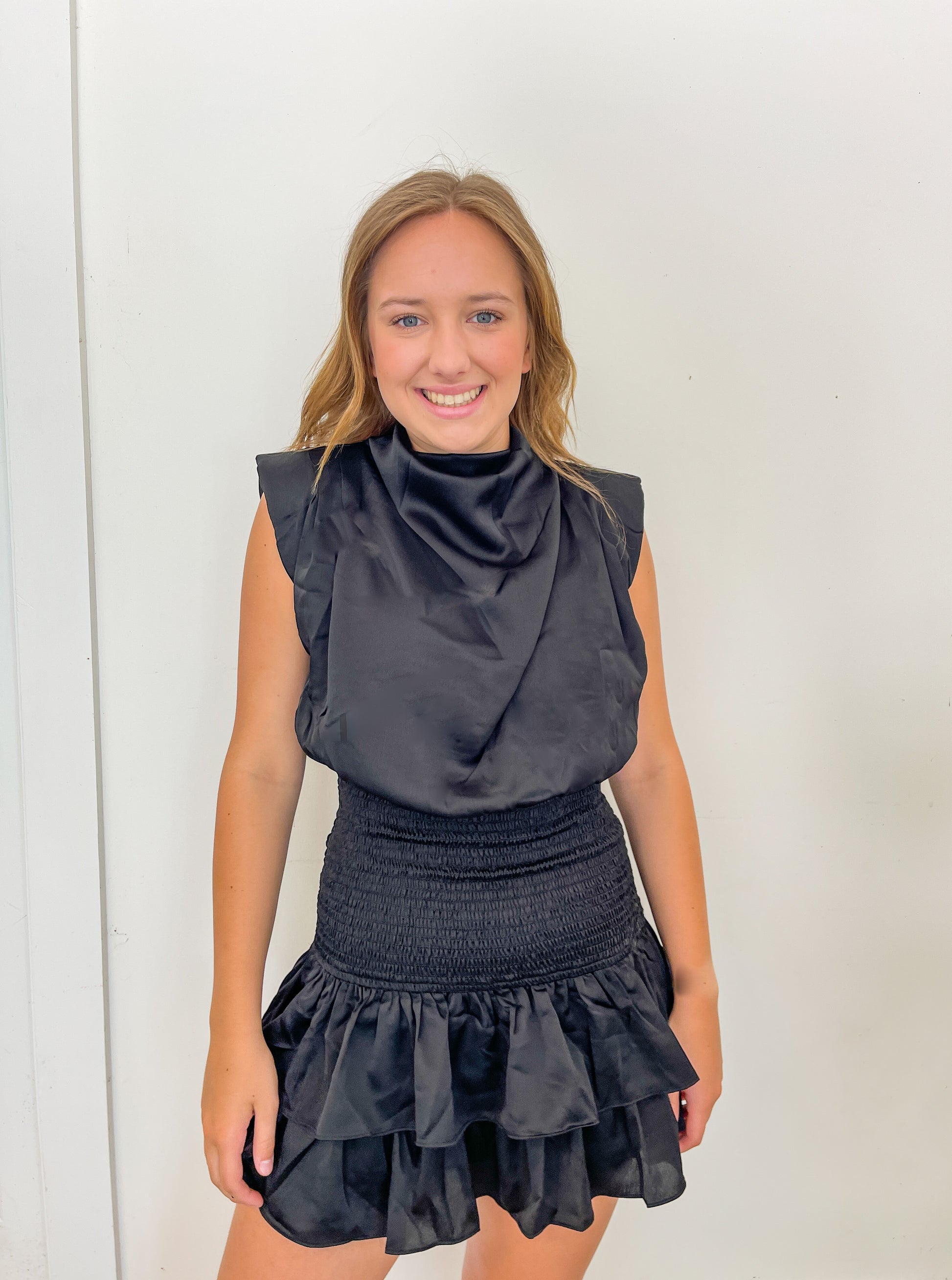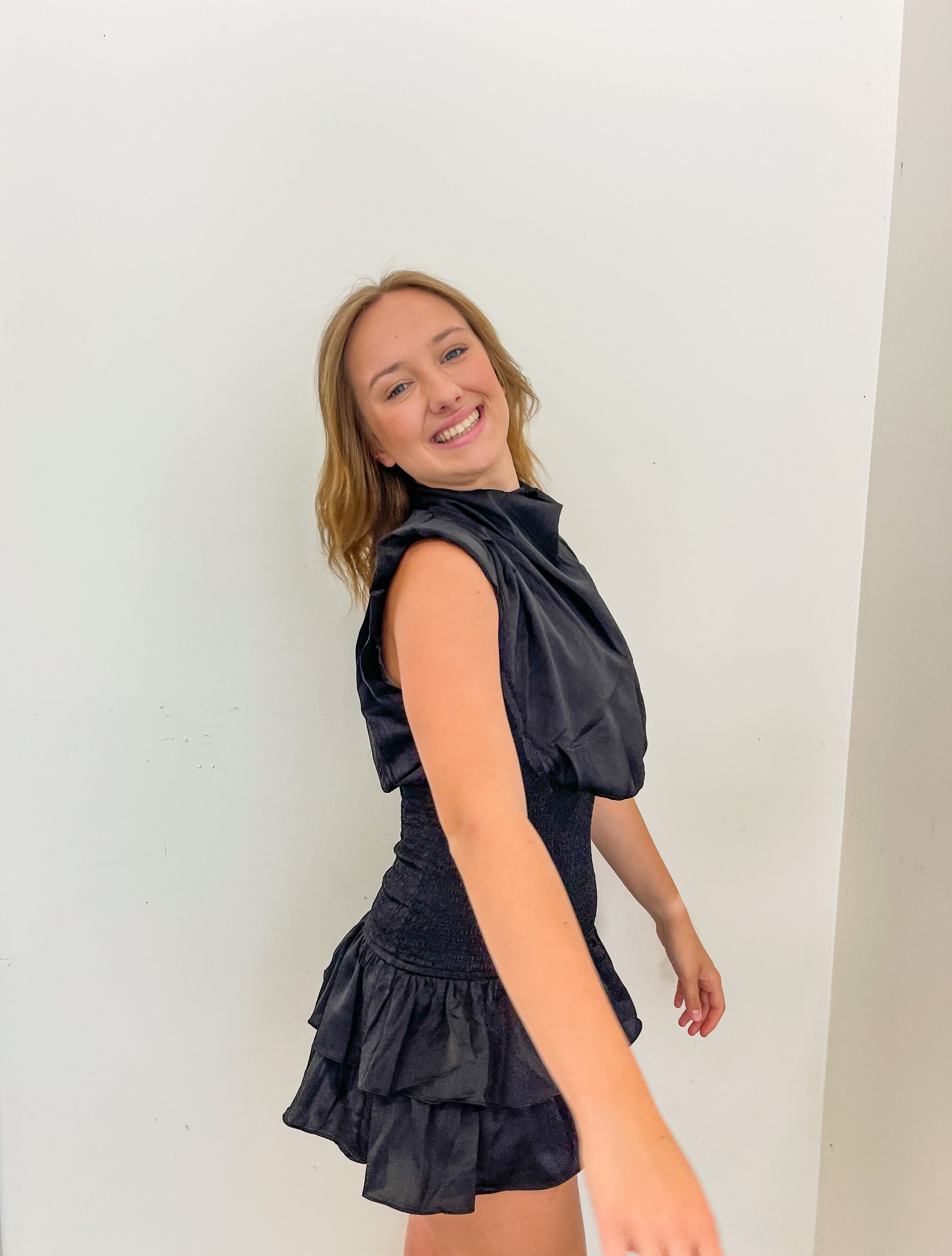 Black dress with button on back. Goes up to neck. Model is 5’10 wearing medium.