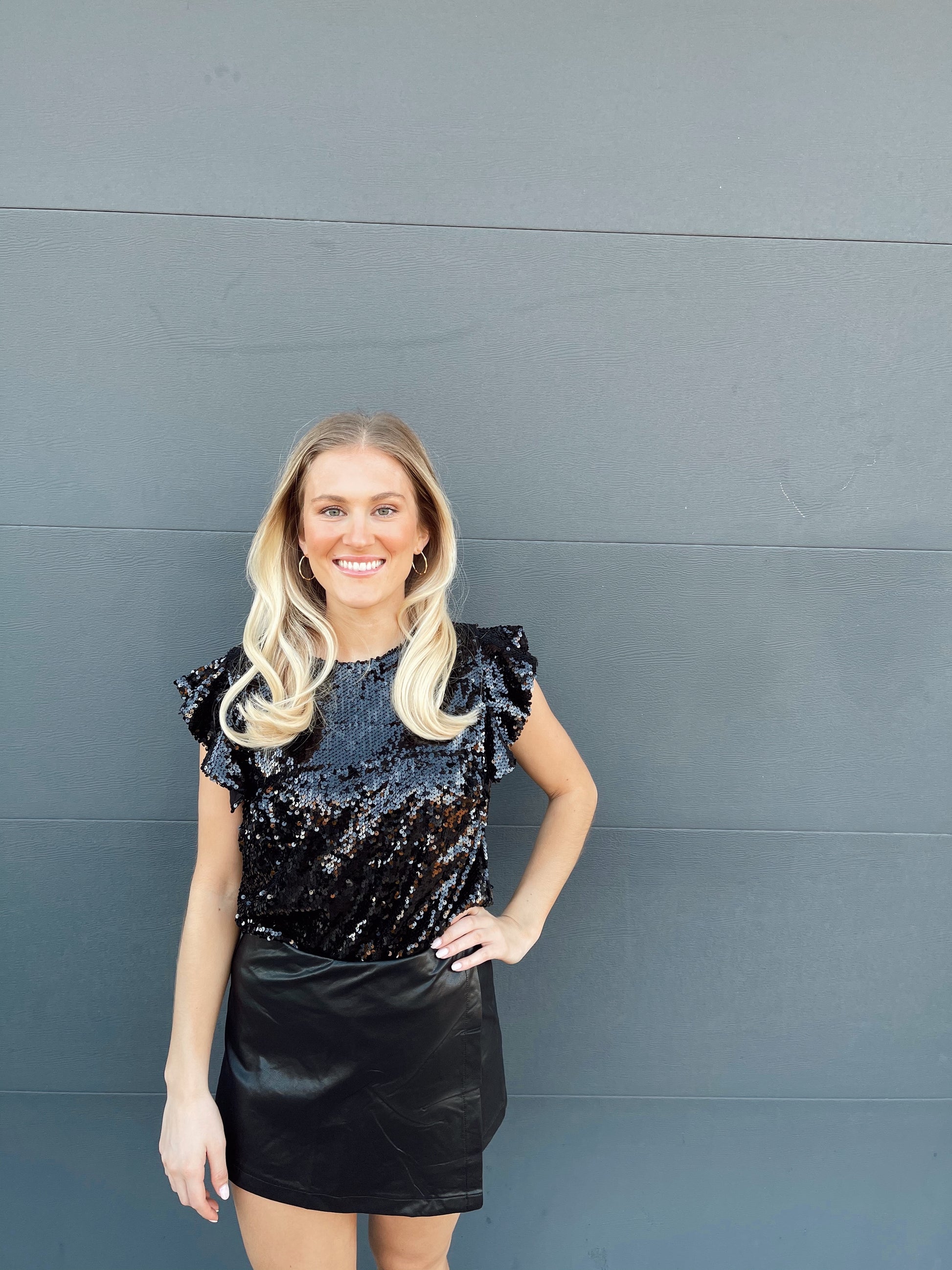 Ruffle sleeves black sequin top. Model is 5'4 wearing a size small.