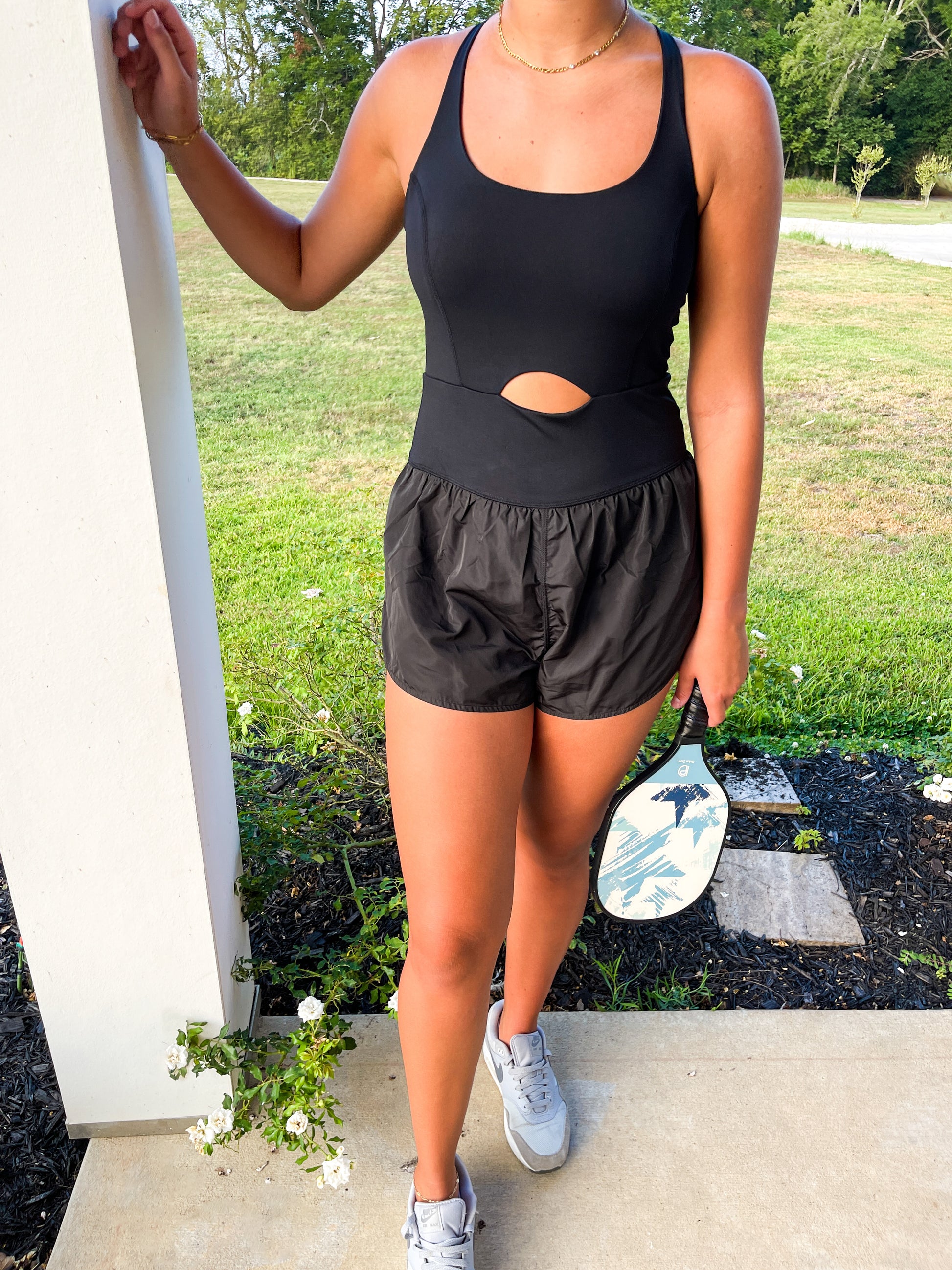Black athletic romper with keyhole. Built in underwear. Model is 5'10 wearing a large.