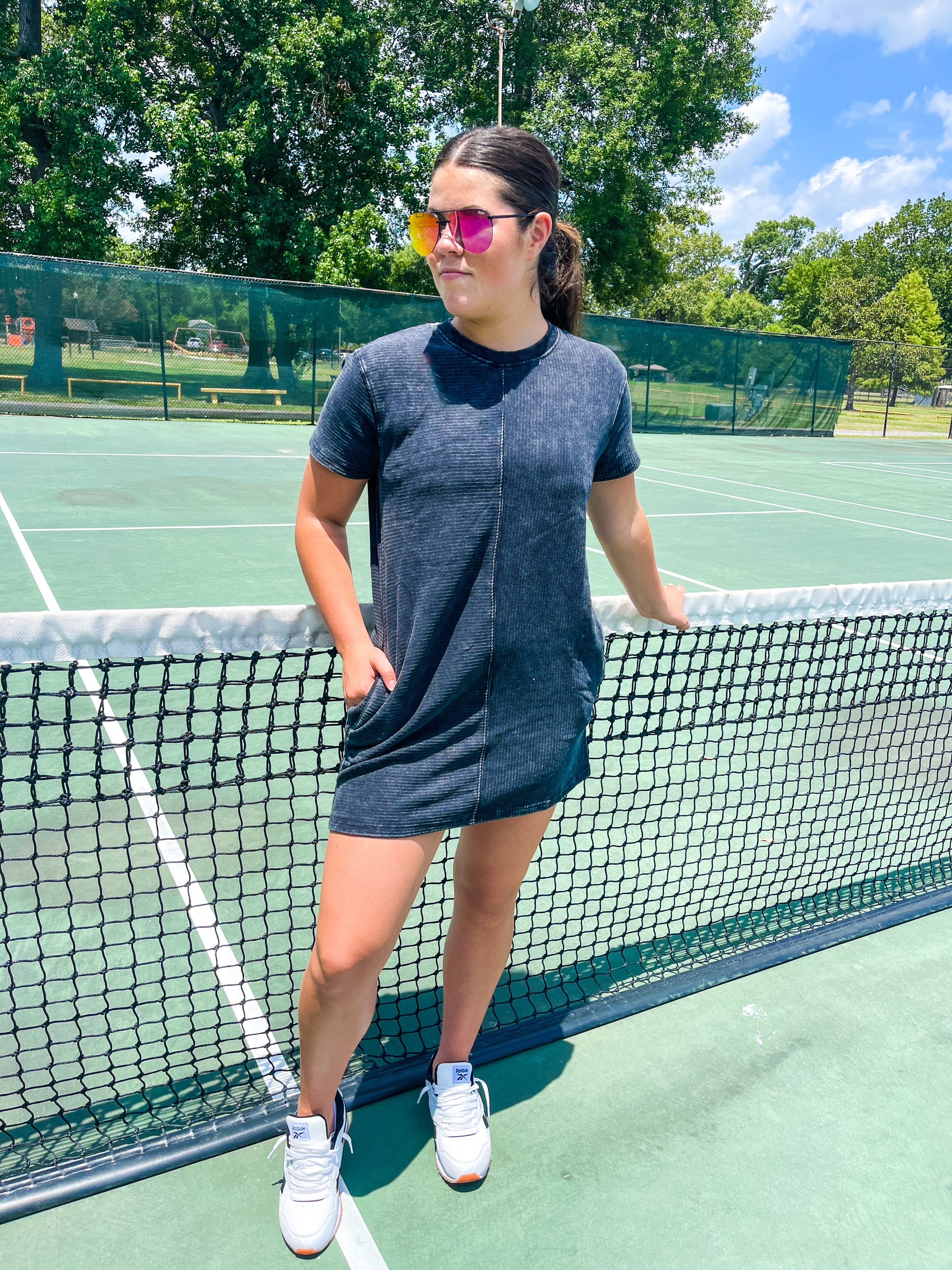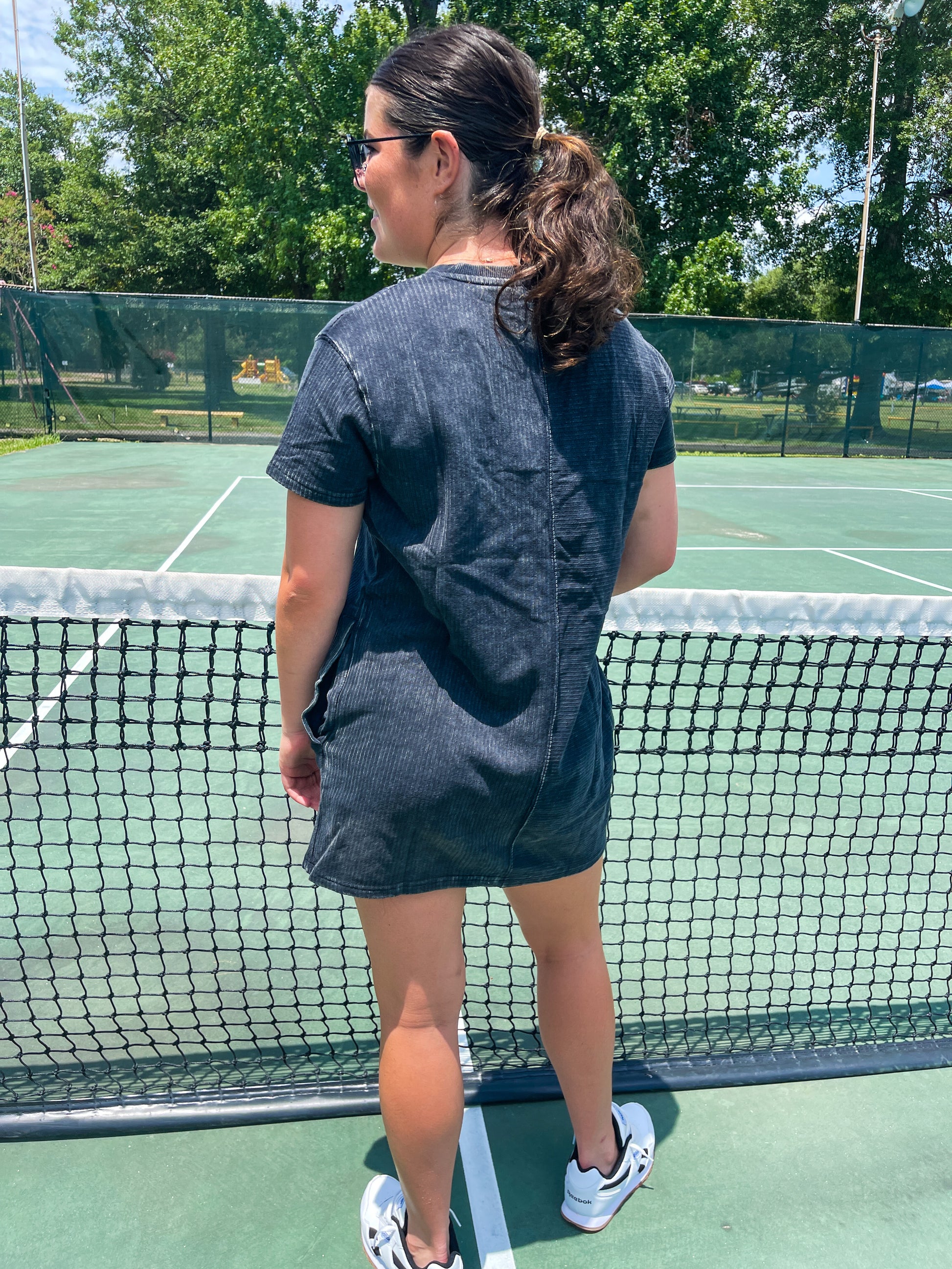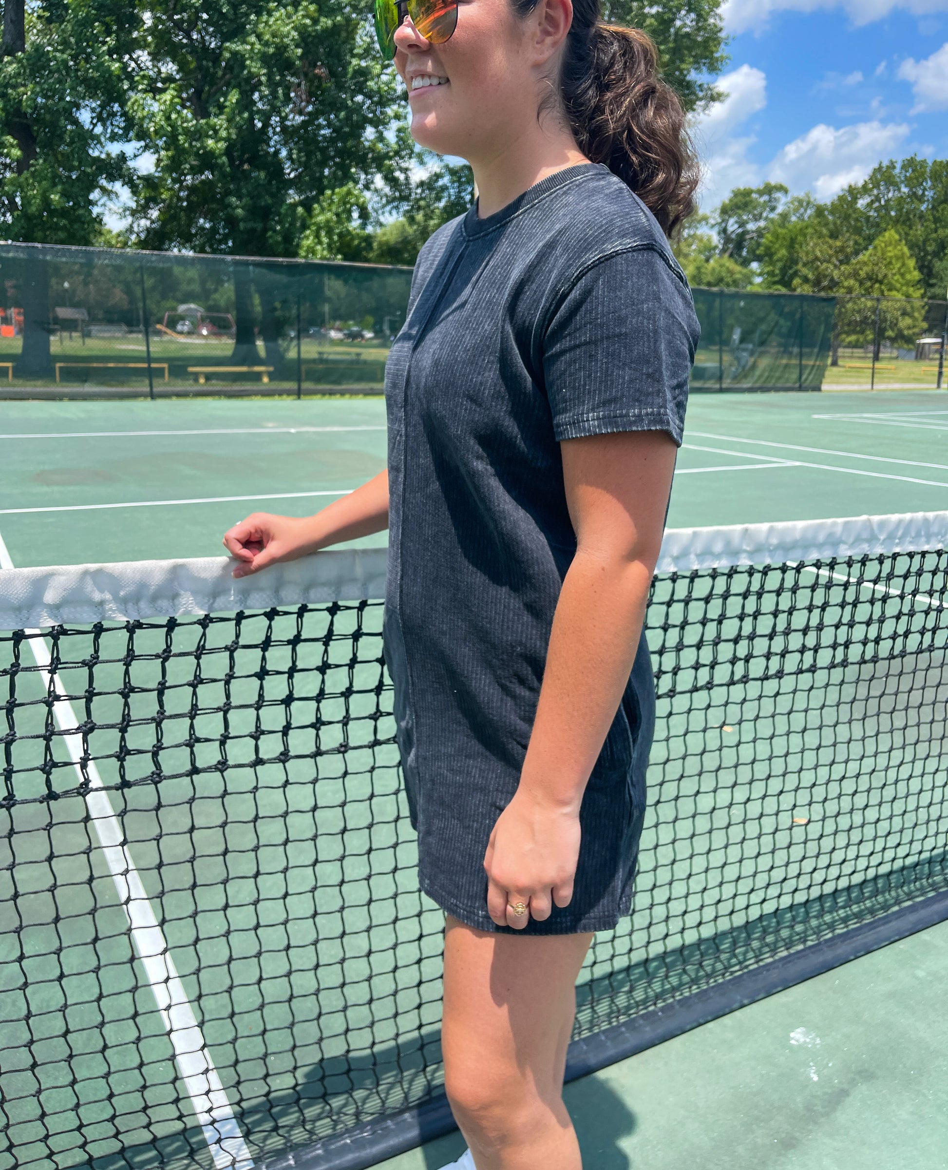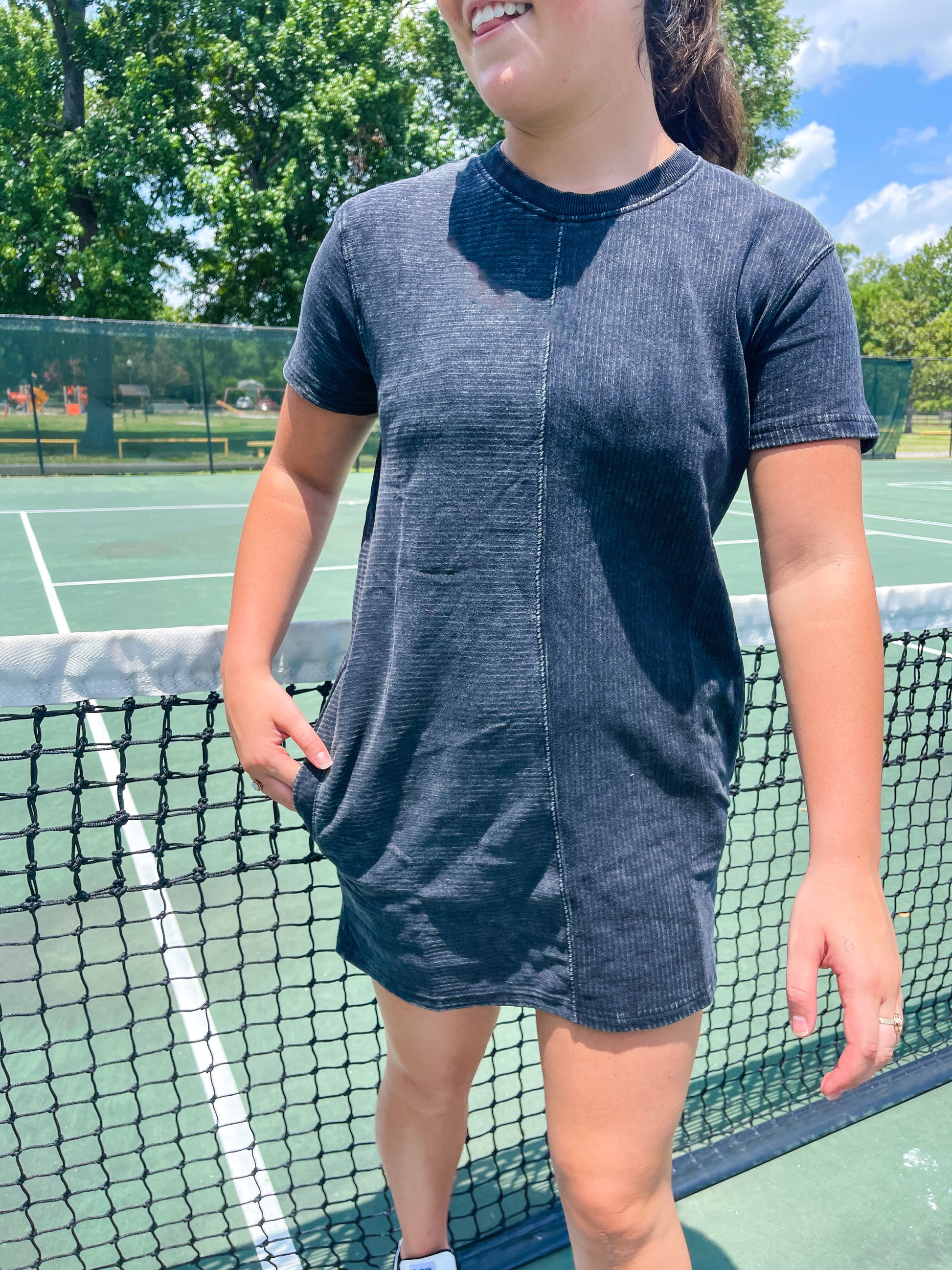 Mineral wash black tennis lounge dress with pockets. Model is 5’6 wearing a small.