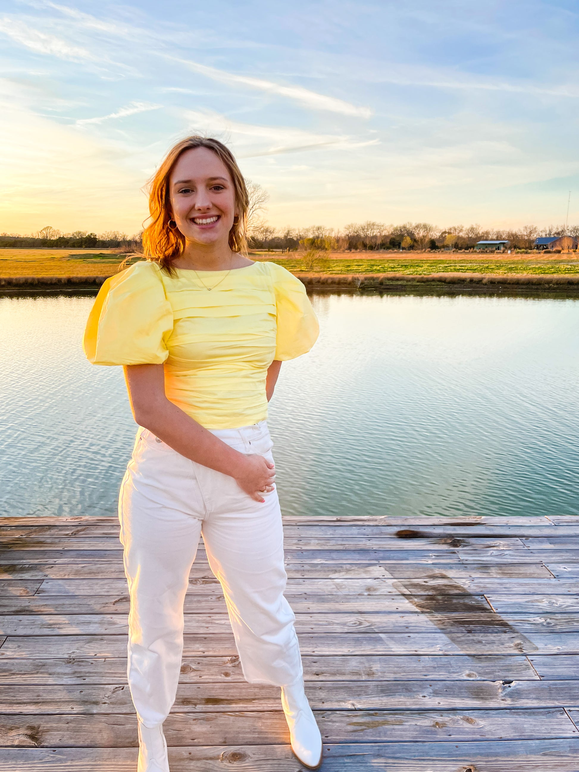 Yellow top with puff sleeves and tight fitting scrunched body. Model is 5’10 wearing a medium. Zipper is on side under arm.