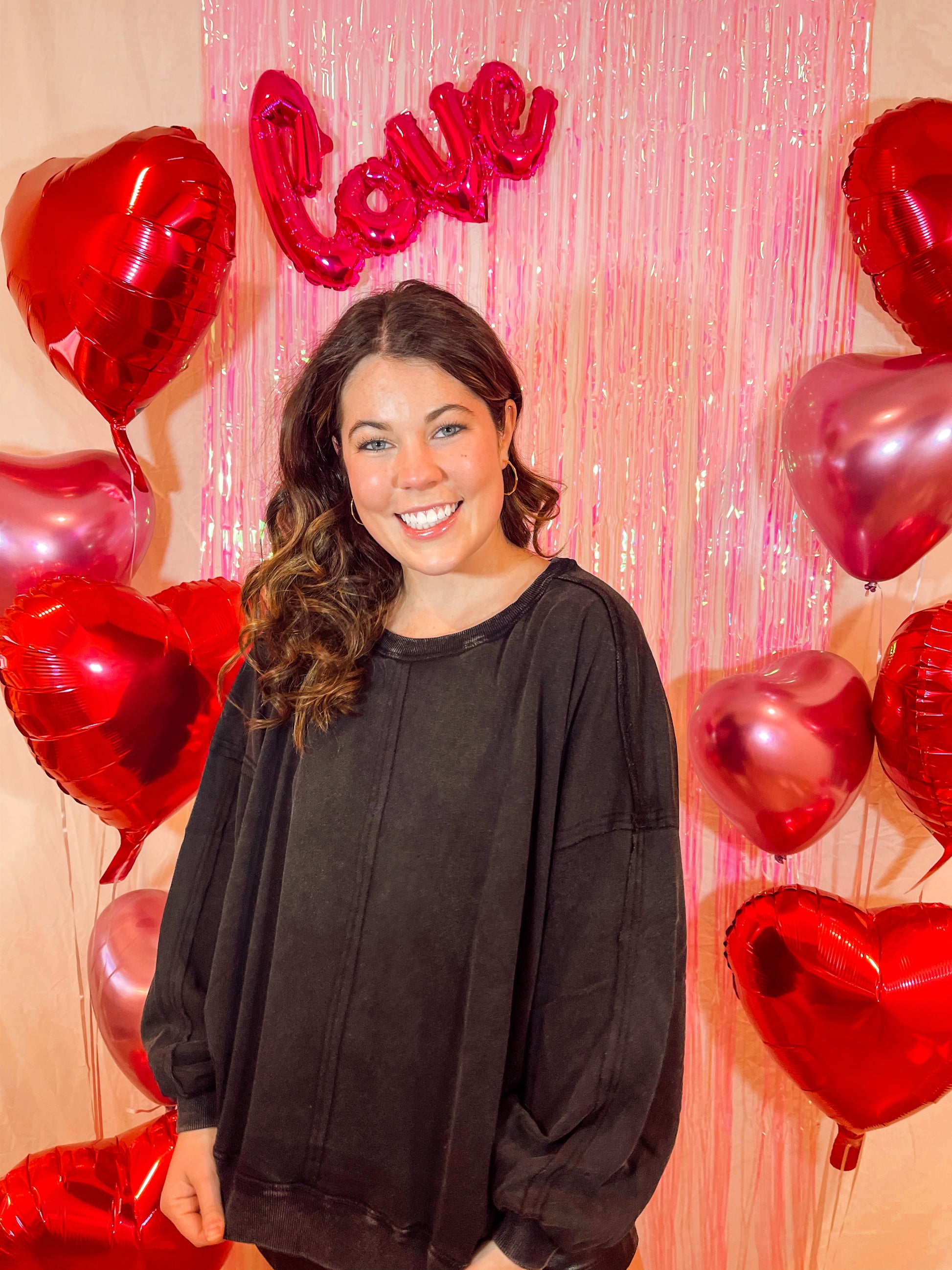 Mineral washed sweater detailed with an open back look. Model is 5'6 and wearing a small.